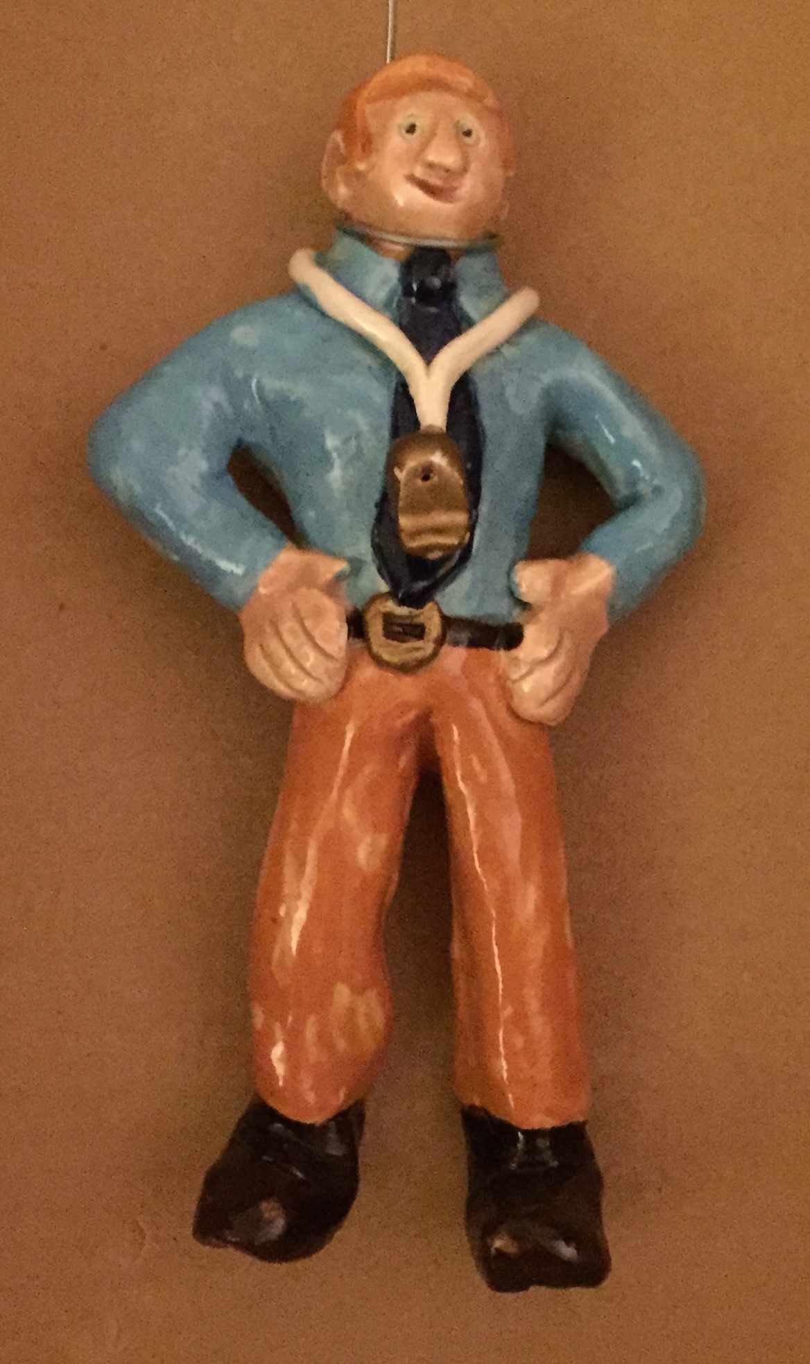 This is the ornament that started it all. If you’re familiar with my dad’s style, this piece definitely has the distinctive characteristics. It just seems like a baby-sized version of a Tom Hubert original, which is the perfect way to commemorate his first baby boy (me). There is a small chip from the fire in 2009, but other than that, it still looks as good as it did 30 years ago.